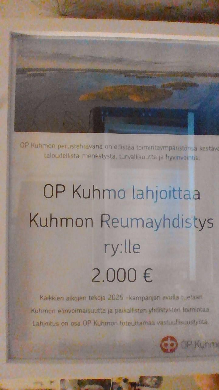 OP Kuhmo lahjoitti Kuhmon Reumayhdistys ry:lle 2000 €. Yhdistys kiittää ja pokkaa!